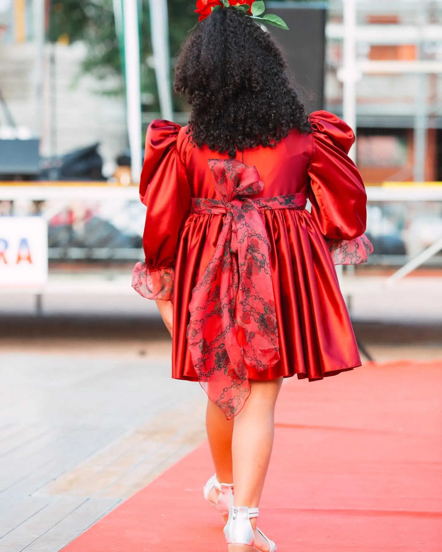 Passante con fiocco in vita in organza di seta con stampa floreale.